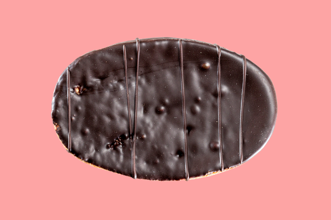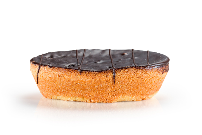 Il tutto è avvolto da un guscio di frolla fragrante e impreziosito da una copertura di cioccolato fondente che ne esalta la nota calda e avvolgente.