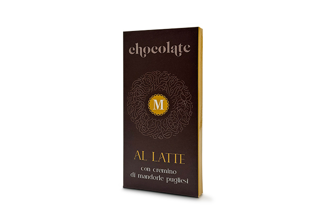 Tavoletta di cioccolato al latte superiore che racchiude al suo interno un cremino di mandorle pugliesi selezionate e cioccolato bianco.