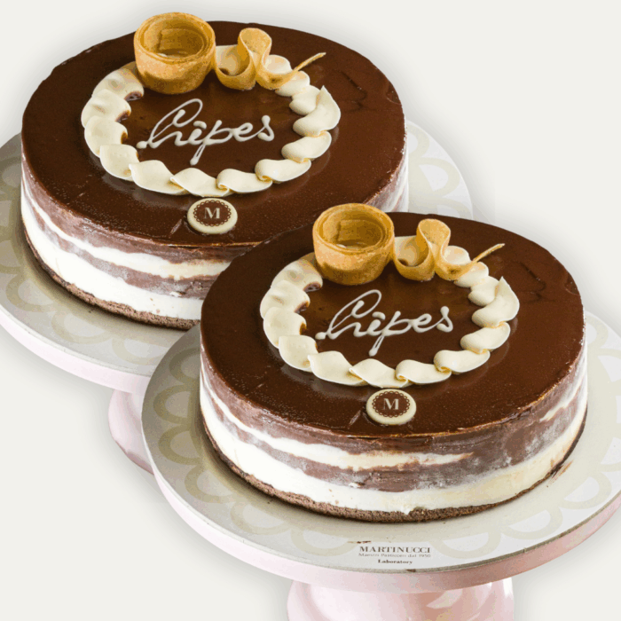 Torta Crepes: con alla base pan di Spagna al cioccolato bagnato al cioccolato e con ben cinque strati di crepes su cui si alternano strati di crema chantilly e di crema gianduja (da nocciole selezionate). Il dolce riceve poi una copertura di crema spalmabile artigianale gianduja. Bagna analcolica al cioccolato. Peso 1.2 kg a Torta.